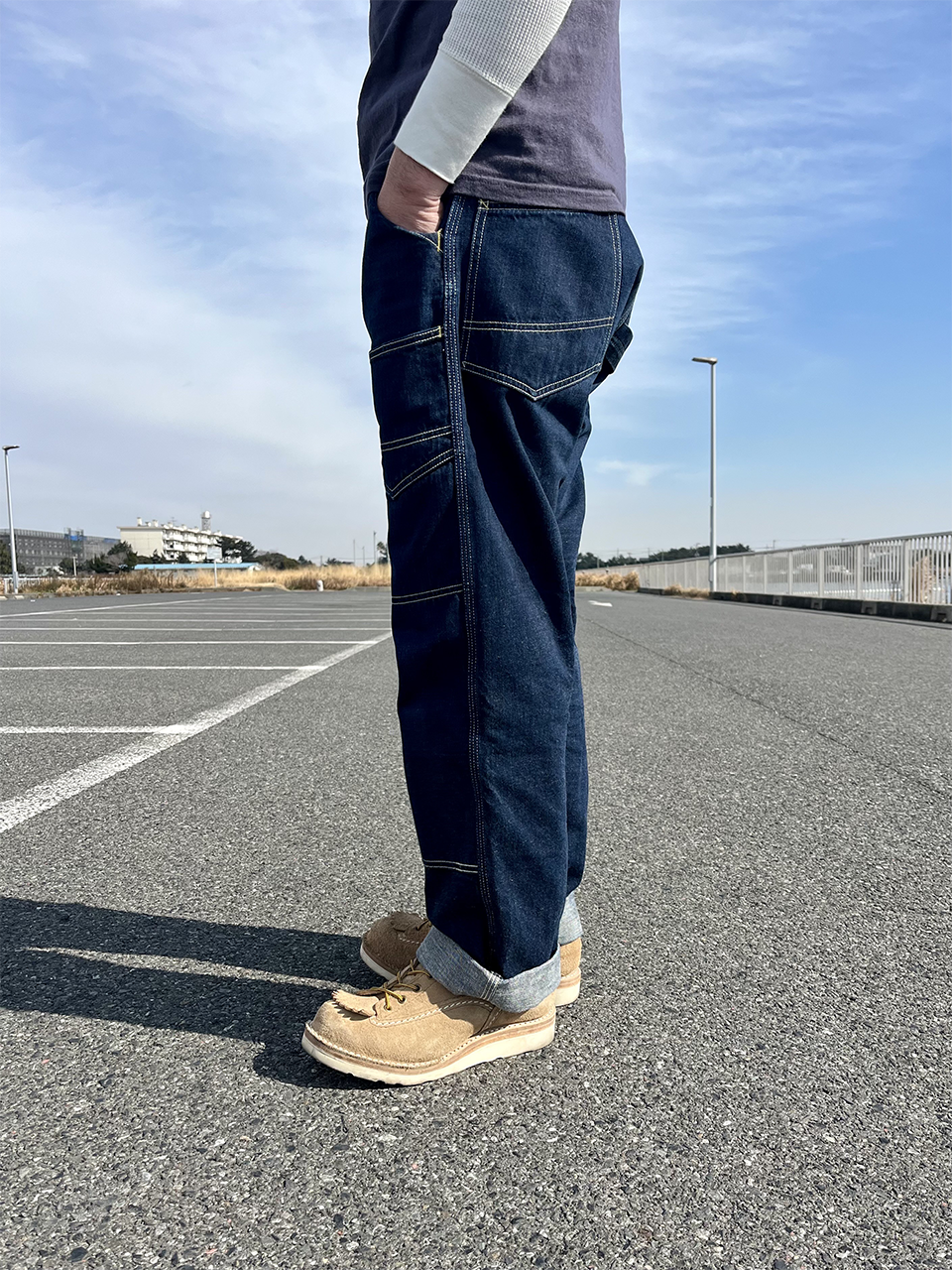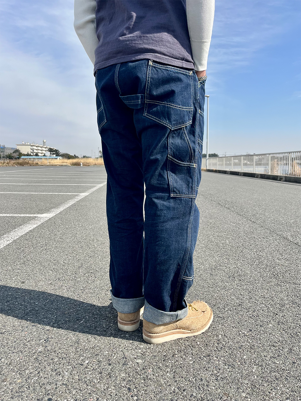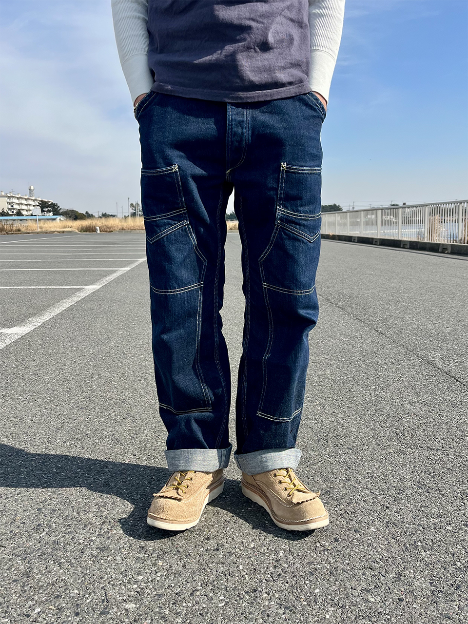 最大の特徴である両モモにポケットが付いているフロントダブルニー、深めのインディゴ生地に映えるホワイトステッチで、デニム自体が色落ちしてくと、ステッチの色と馴染んでいき、より雰囲気ある印象に変化していきます。