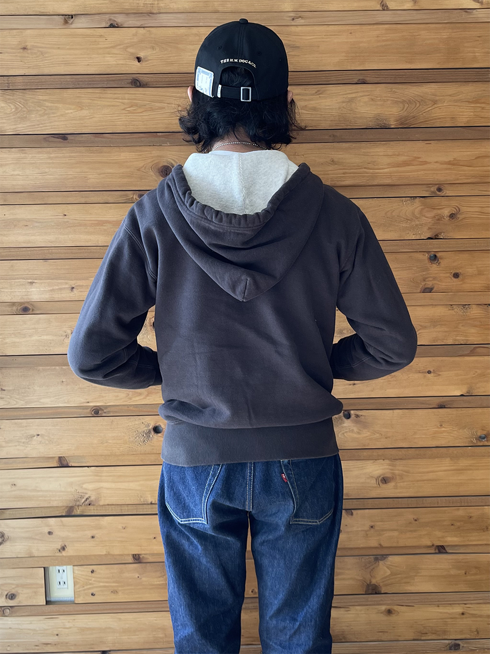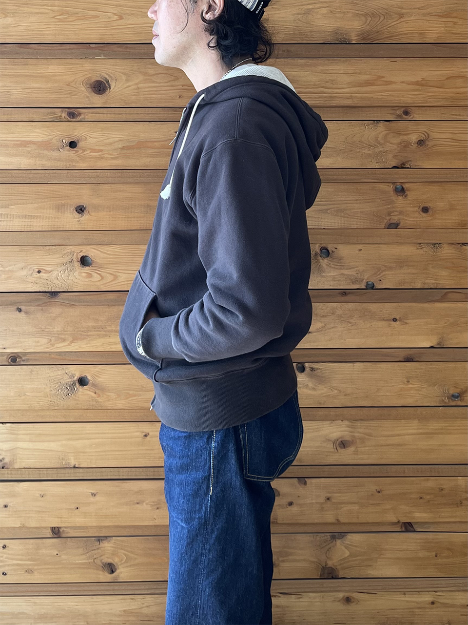 フード裏まで施されたワッフル生地のライニングの雰囲気が良く、さらにはフード自体の深さとボリューム感が絶妙で、ジャケットなどを重ねた時のアクセントとして抜群の存在感を放ちます。