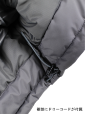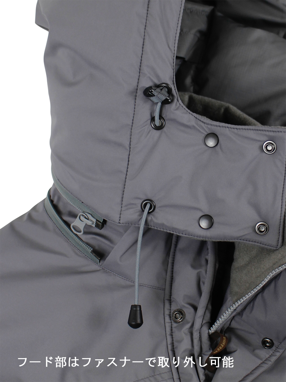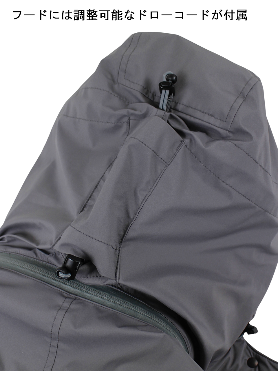 高さのある大きめサイズのフードはドローコードで3段階の調整が可能且つ、取り外しが可能になっています。