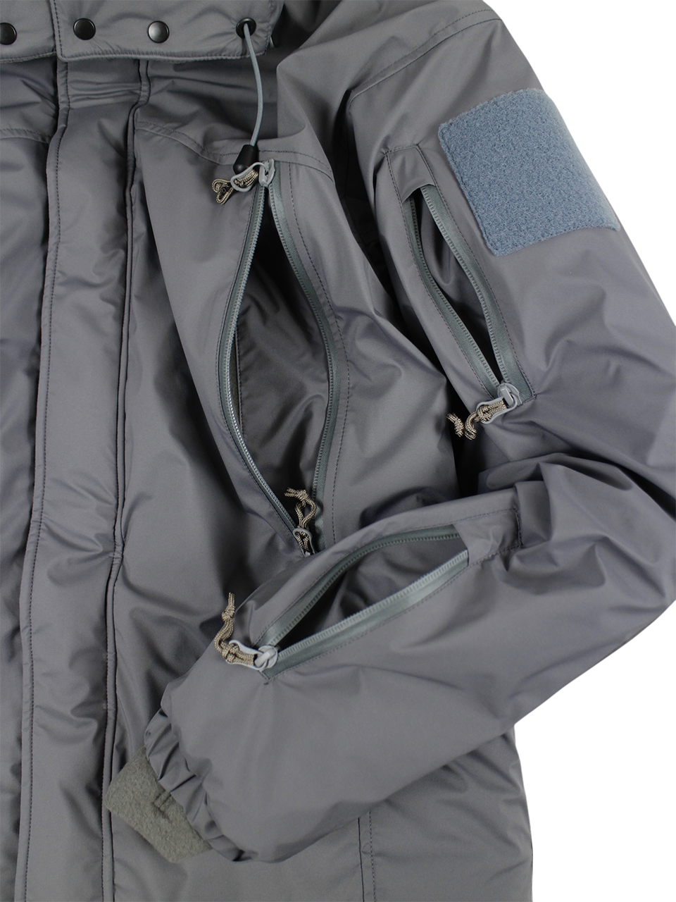 表地は撥水性が高いソフトシェルナイロン、中綿には非常に厚みのあるプリマロフトを使用、動きやすさと最上級の防寒力を兼ね備えたスペックです。