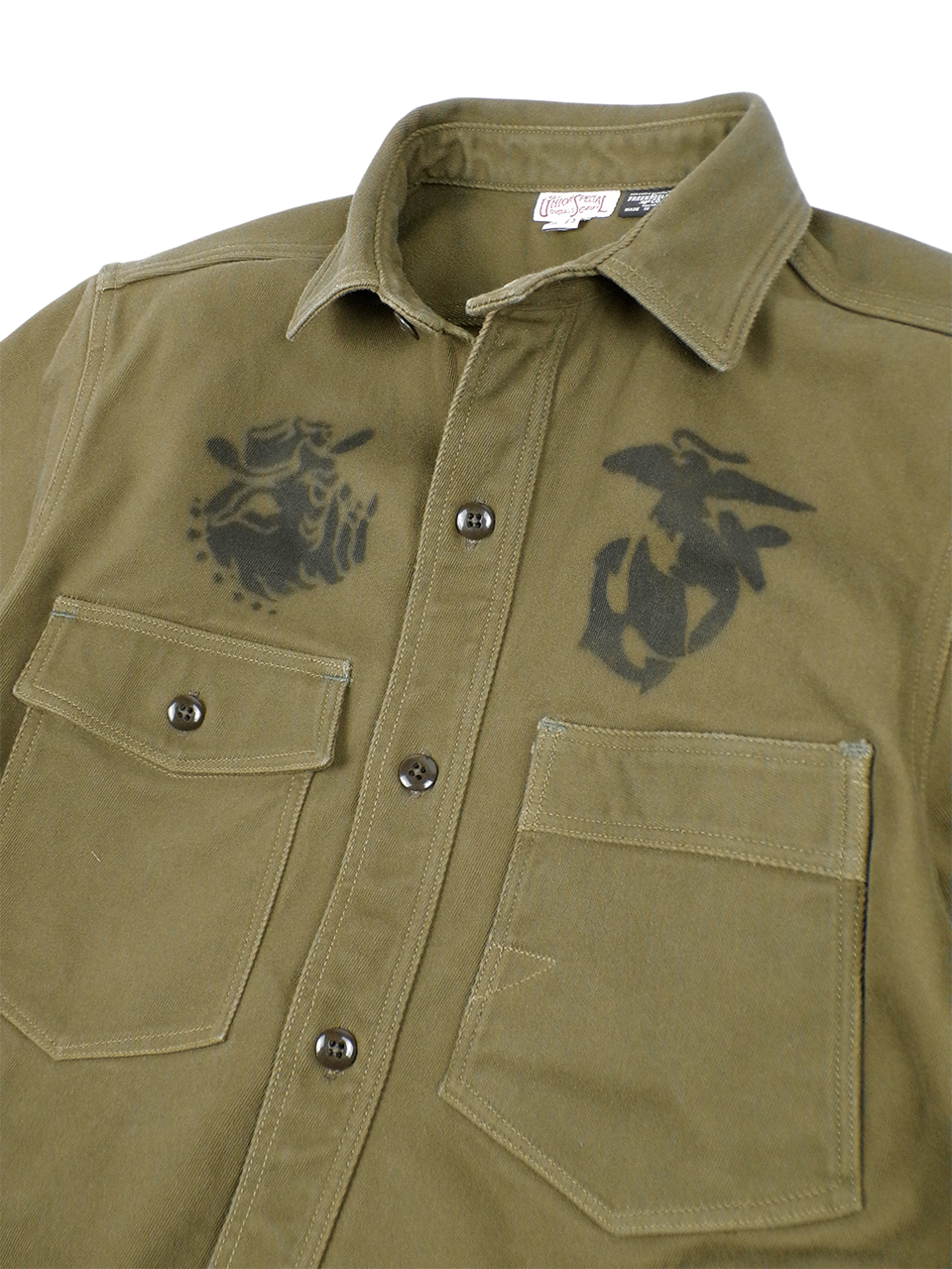 さらに今作の肝であるカスタムは、ステンシルと染み込みプリントと異なる手法を用いて製作、海兵隊が着用していたシャツをイメージした抜群の雰囲気を漂わせるデザインになっています。