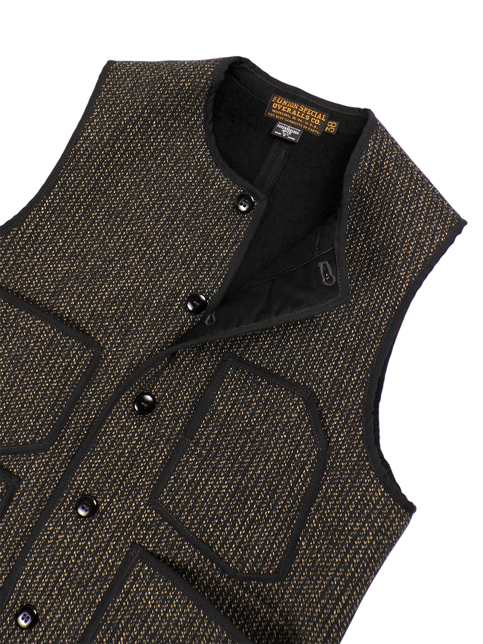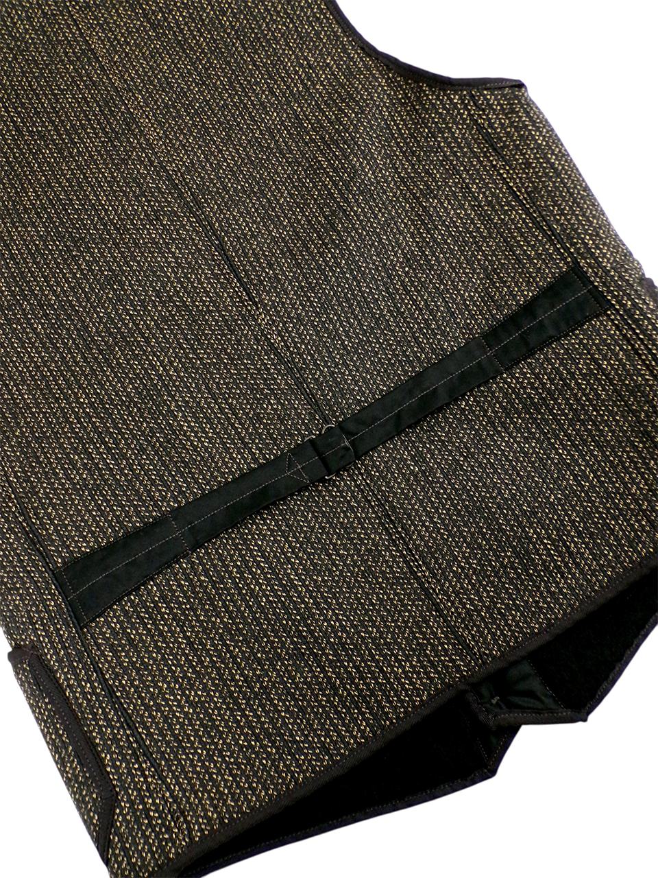ベージュとブラックを絶妙な配分で組み合わせて織り上げられた生地は、単調な印象にならず着るだけでスタイルが様変わりする、ベストというアイテムのポジションを最大限に活かしてくれる要素になっています。