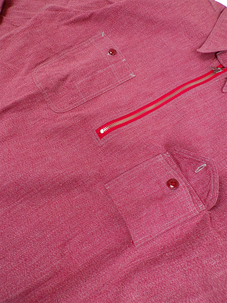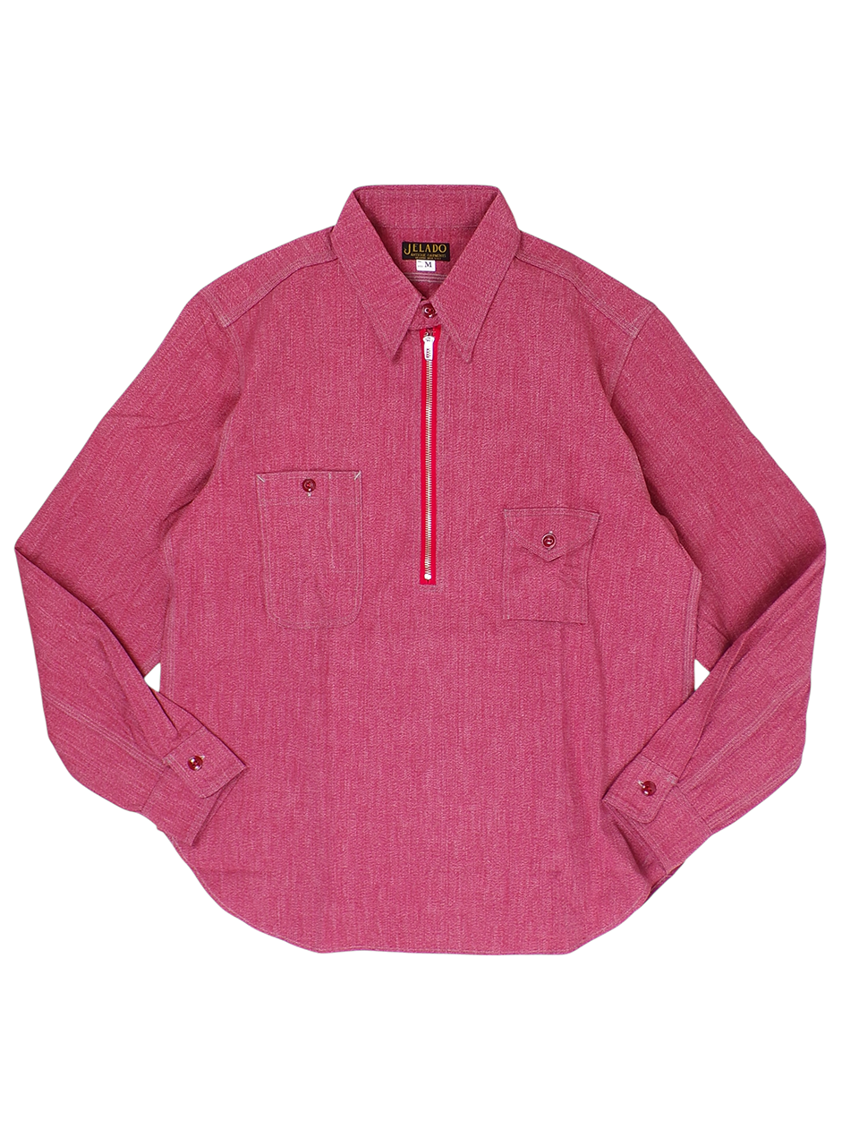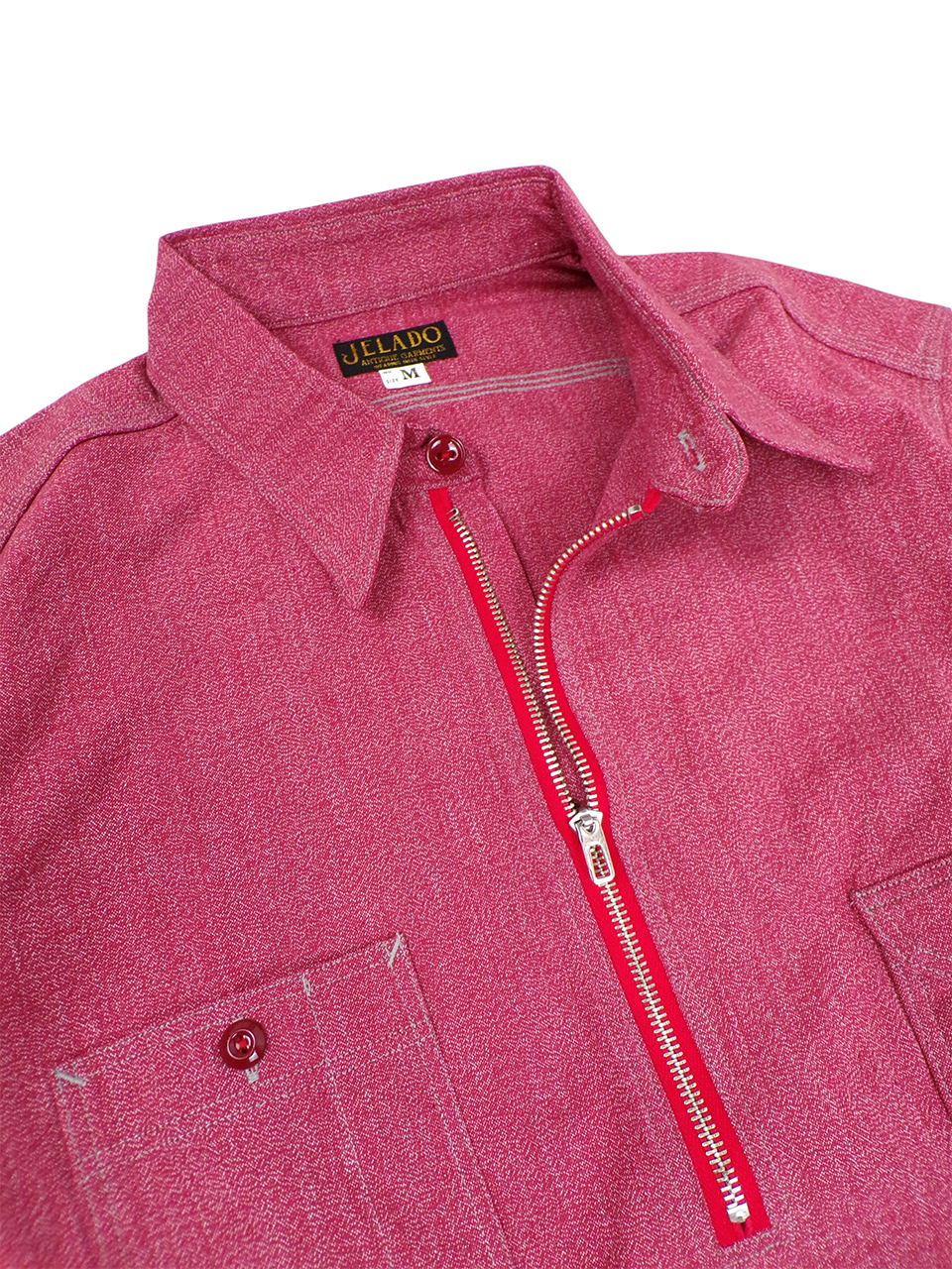 BIG YANKのヴィンテージをベースにJELADOが再現したモデルで、左右非対称のポケットと、胸の下あたりまでのファスナーが絶妙なアクセントになっています。