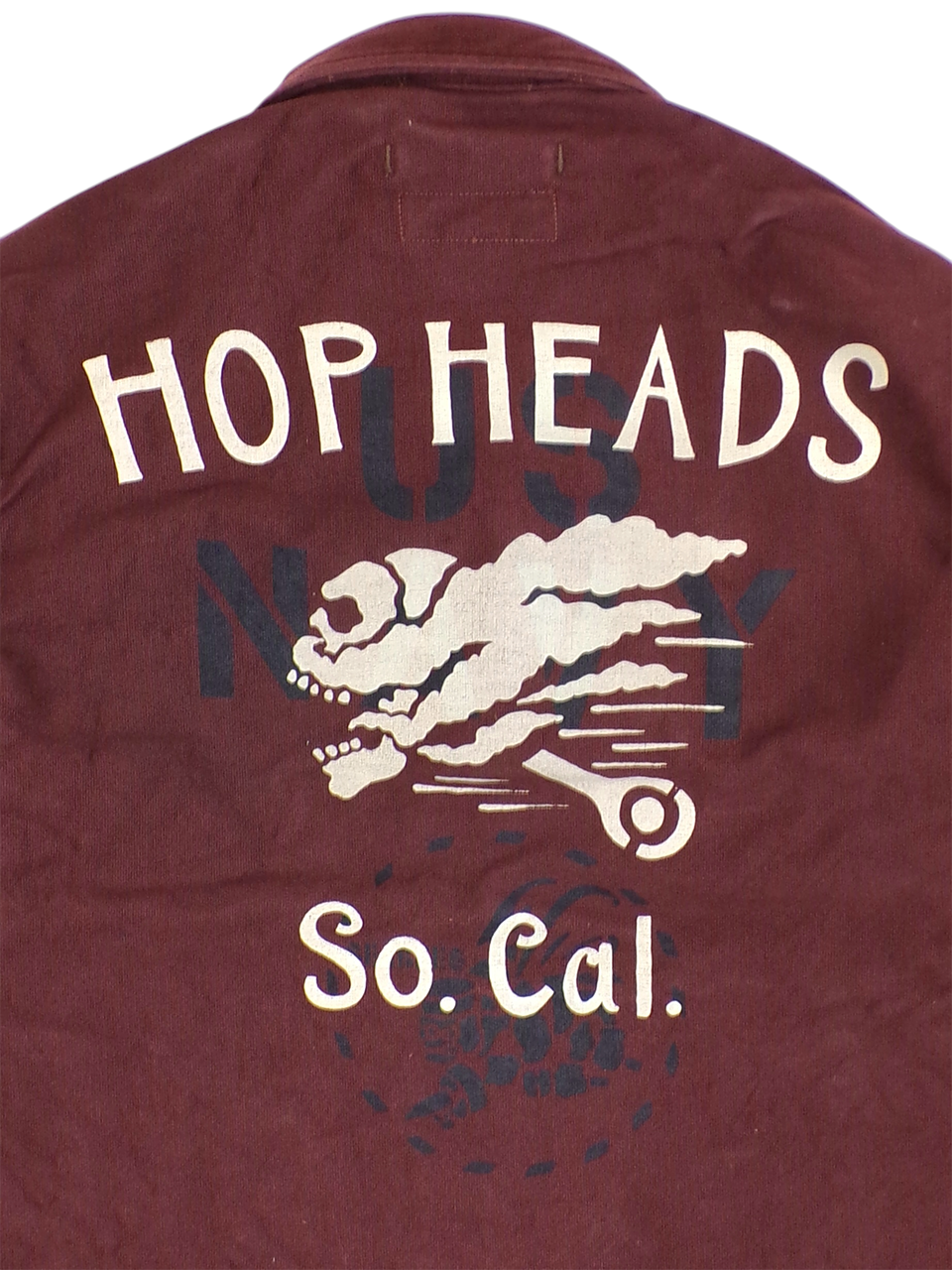 軍の退役後にホットロッドに熱狂した人物が、自身でカスタムを施したというストーリーが込められており、ワッペンはローカルメイド風のあえて少し荒っぽい印象に仕上げ、背面は「U.S.NAVY」の文字とその下にはシービーズのマーク、その上から割れラバープリントで「HOP HEADS」とワッペン同様のスカル、そして「So. Cal. (サザン・カリフォルニアの意)」が施された、とことん抜かりの無い作り込みとなっています。
