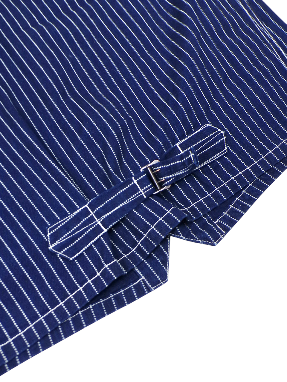 青みがかったインディゴの生地に落とし込んだ抜染プリントによるウォバッシュのストライプが、インでもアウトでもスタイルに抜群のアクセントを加えてくれる、ベストというポジションを最大限に活かした一着。